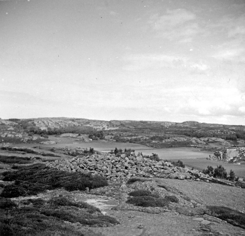 Enligt text: "a 1330. Bronsåldersröse. Beläget 150 m NO om Nasseröds mosse. Rätt bakom röset synes hällkistn.-området vid Nasseröd Klova och än längre bort det vid S. Torp. Foto fr SSO den 20.7.-42 Å.F".