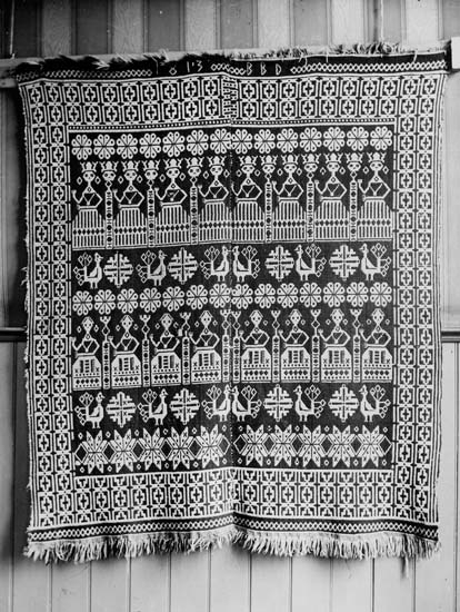 Täcke som i spegeln innehåller rader av fåvitska (oförståndiga) jungfrur med sina tända facklor och visa jungfrur längre ner med släckta facklor, stjärnor samt tuppar. Bården har återkommande geometrisk form. Frans i båda kortändarna. Två vävda våder ihopsydda till ett täcke.