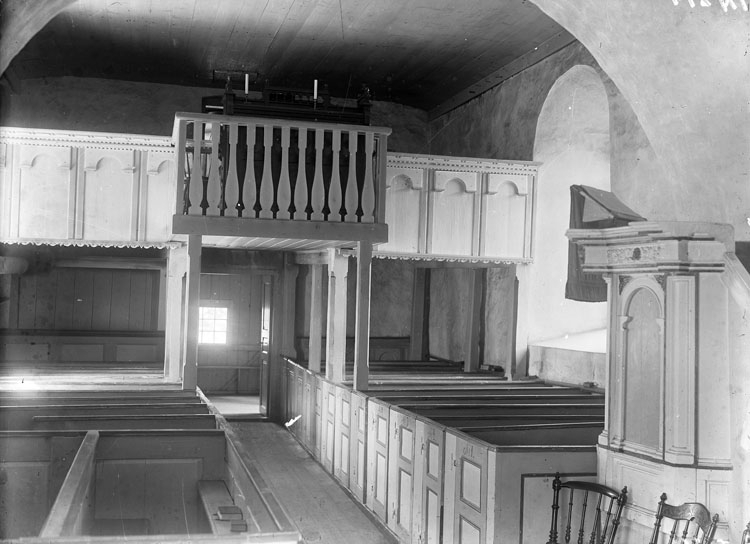 Enligt tidigare noteringar: "Interiör från Resteröds kyrka, orgelläktare. Före renoveringen."