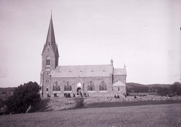 "Bokenäs nya kyrka". Kyrkobesökare som är samlade utanför kyrkan.