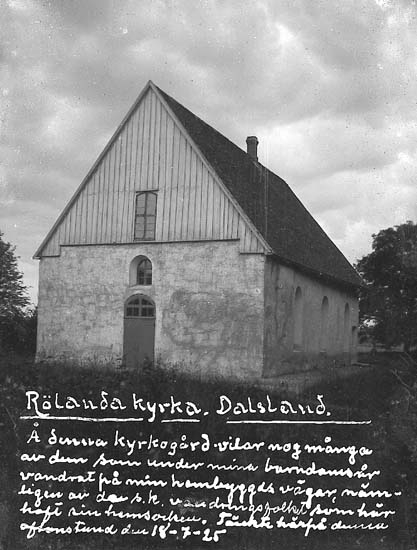 Enligt text på fotot: "Rölanda kyrka. Dalsland. Å denna kyrkogård vilar nog många av dem som under mina barndomsår vandrat på min hembygds vägar, nämligen av de s.k. vandringsfolket som här haft sin hemsocken. Tänkte härpå denna aftonstund den 18-7-25".