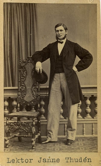 Text på kortets baksida: "Lektor Carl Johan Andreas Thudén, f. 1832. Son till prosten Carl Adolf Thudén i Bro. Lektor i Halmstad".