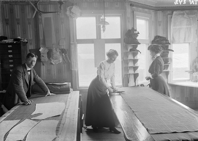 Enligt senare noteringar: "Schwartzman & Nordsströms, s k "mellanman". J. Nilssons syfabrik, Erik Dahlbergsgatan. Interiör. J. Nilsson och hans två kvinnliga tillskärare."