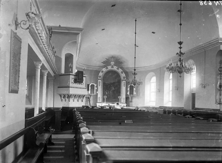 Enligt tidigare noteringar: "Interiör Uddevalla kyrka, mot koret med altartavla, t.v. predikstol."