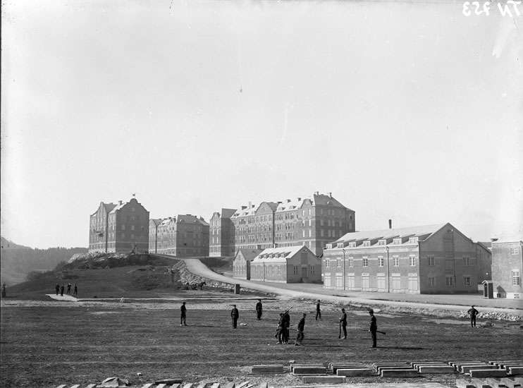 Enligt tidigare noteringar: "Bohusläns regementes kasernbyggnader, i förgrunden värnpliktiga under enskild utbildning."