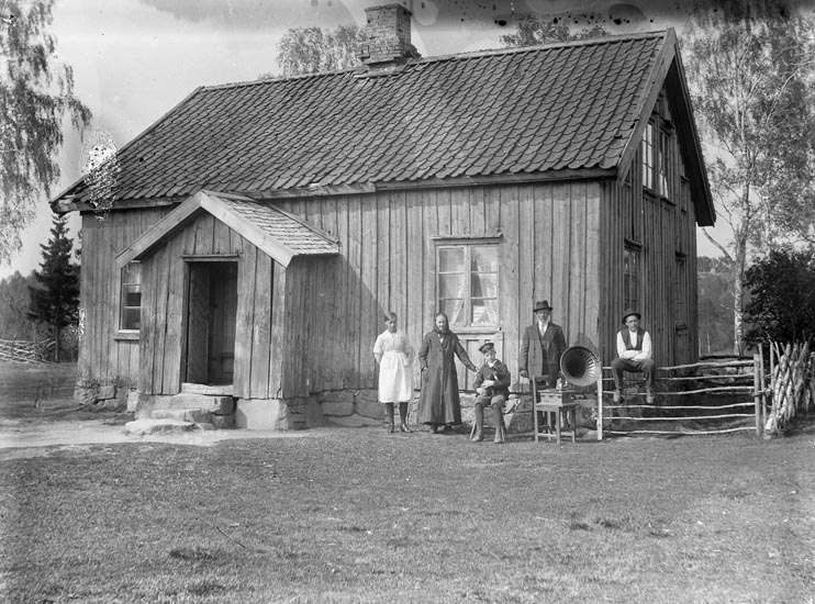 Famlij framför enkelhus i Hede med husdjur och trattgrammofon