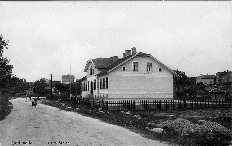 Tryckt text på vykortets framsida: "Uddevalla Östra Skolan".