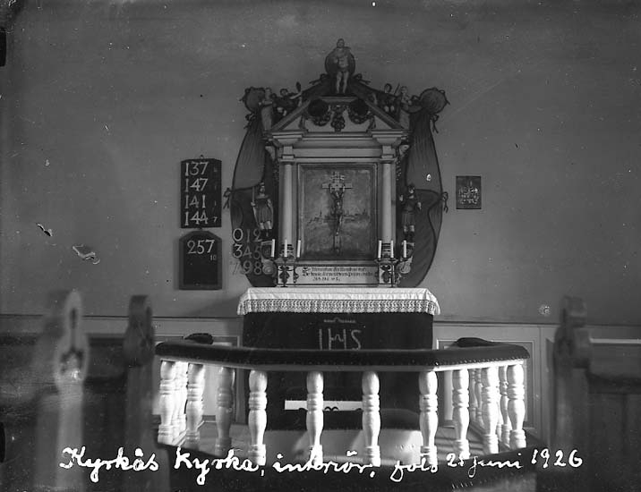 Enligt text på fotot: "Kyrkås kyrka, interiör, foto 25 juni 1926".
