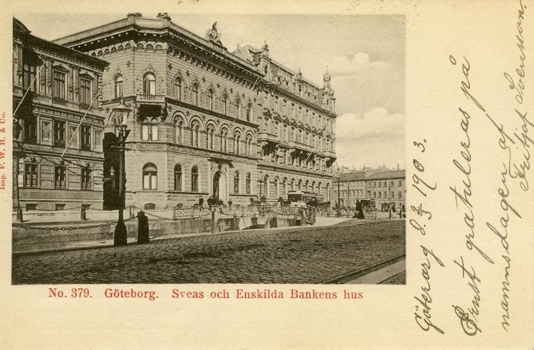 Notering på kortet: Göteborg. Sveas och Enskilda Bankens hus.