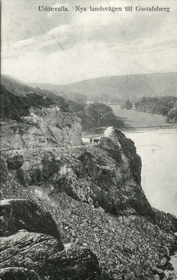 Tryckt text på vykortets framsida: "Uddevalla, Nya landsvägen tilll Gustafsberg."