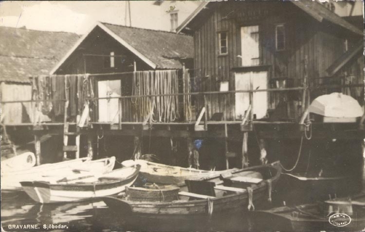 Tryckt text på kortet: "GRAVARNE. Sjöbodar".