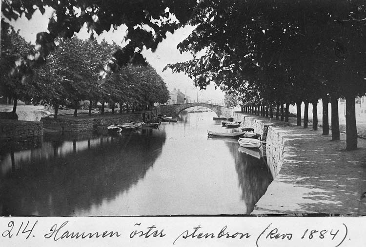 Text på kortet: "214. Hamnen öster stenbron (revs 1884)".