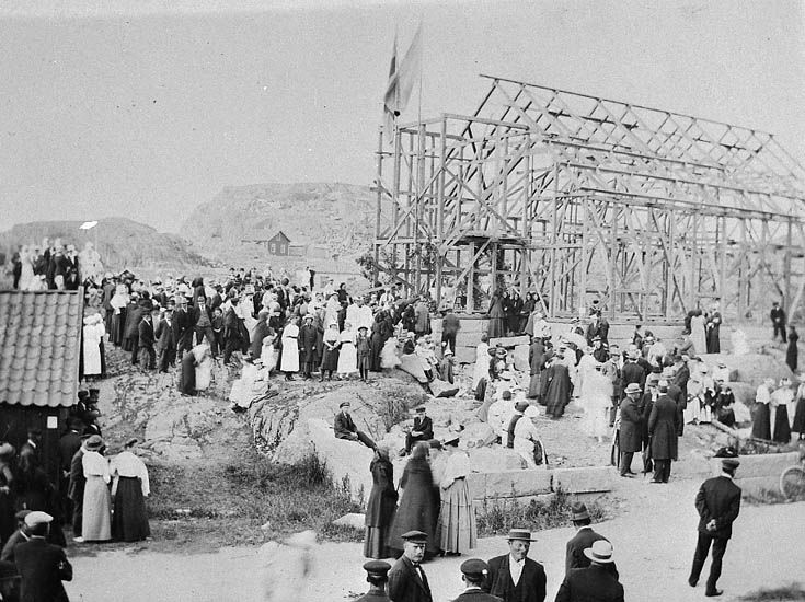 Enl. tidigare noteringar: "Kyrkobygge, Bovallstrand kapell under uppförande. Invigning av kyrkomur samt inmurning av dokumentskrin. 8/8 1916.