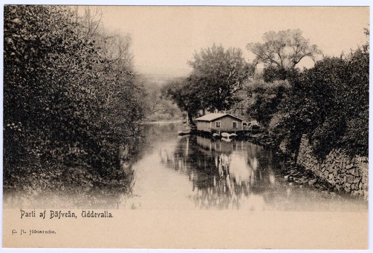 Tryckt på kortet: "Parti af Bäfveån, Uddevalla."