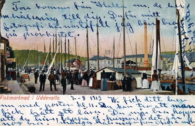 Tryckt på kortet: "Fiskmarknad i Uddevalla."