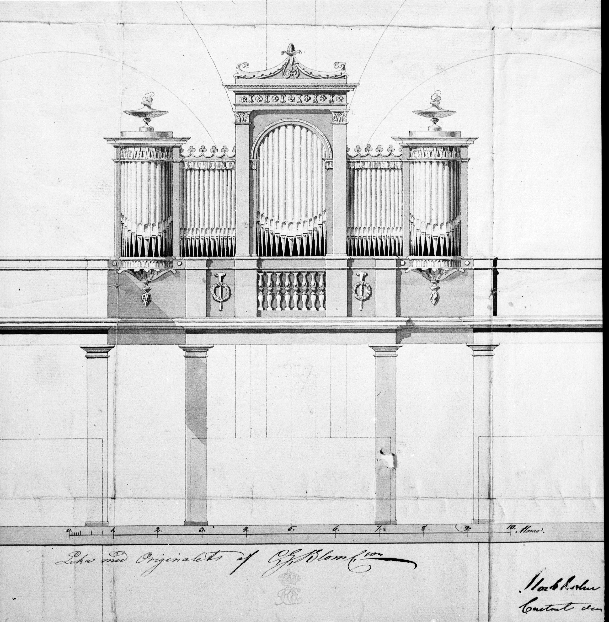 Ritning till orgelfasad av C.G. Blom Carlsson, 1838. Avfotografering.