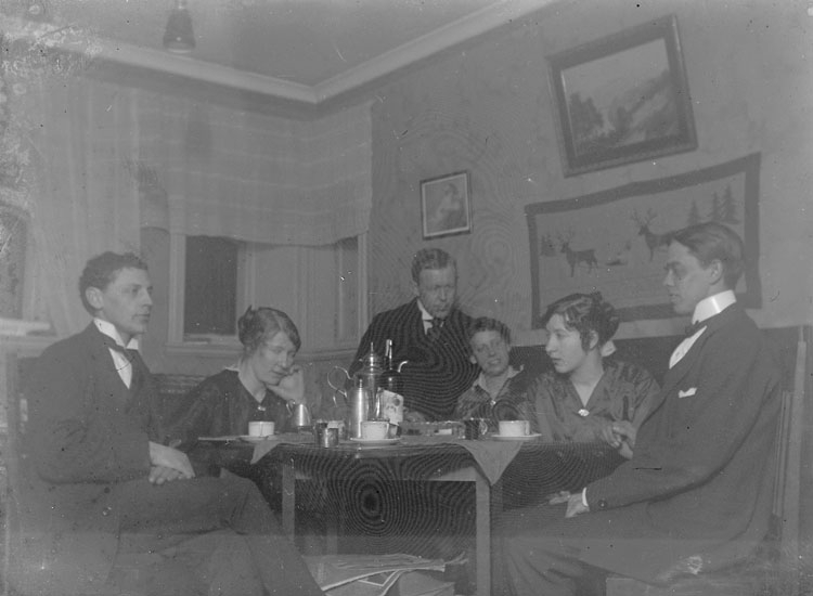 Enl. text i blå bok: "Interiör, tre damer och tre män runt kaffebord."