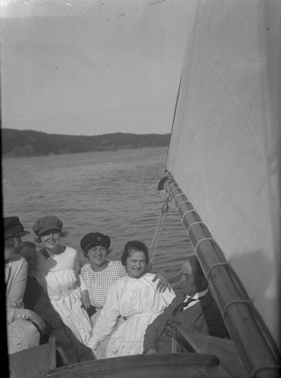 Enl. text i blå bok: "Personer i sittbrunnen på segelbåt."