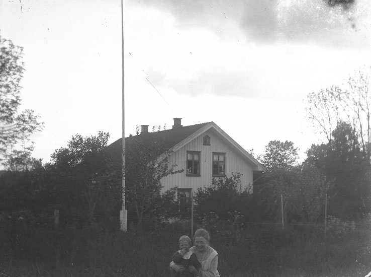Enl. text i blå bok: "Villa. Dam med barn i förgrunden."