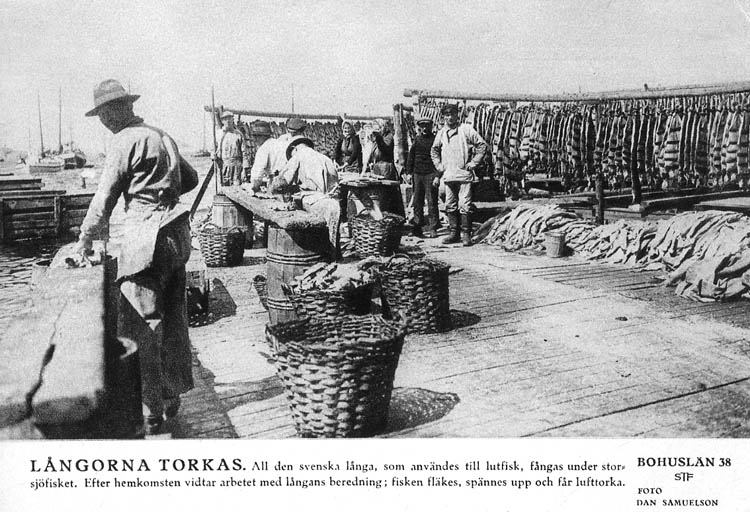 All den svenska långa, som användes till lutfisk, fångas under storsjöfisket. Efter hemkomsten vidtar arbetet med långans beredning; fisken fläkes, spännes upp och får lufttorka.