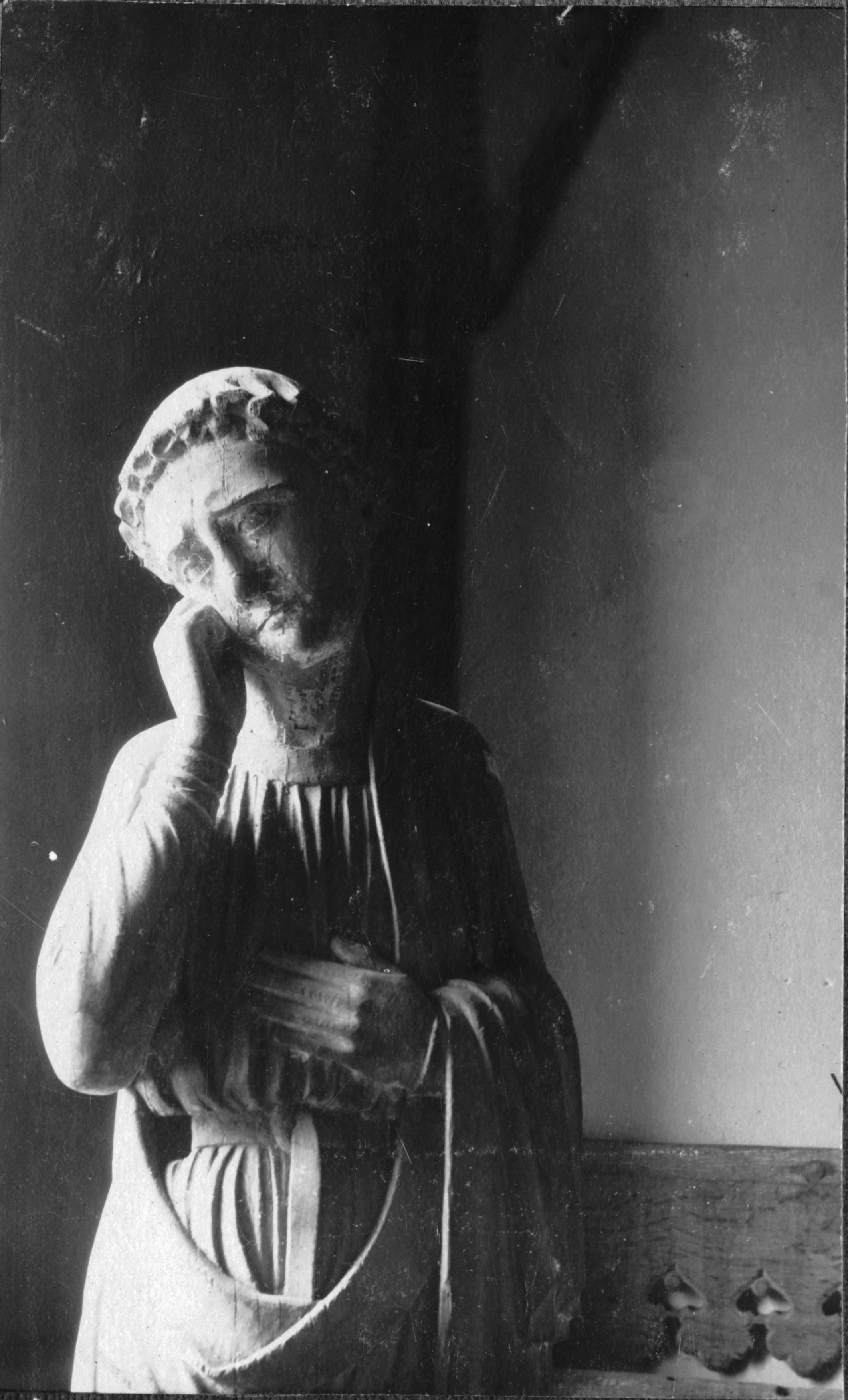 Skulptur av trä framställande sörjande Maria. Omkring 1240-1250.