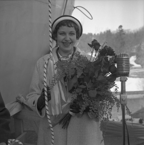 Dop och sjösättning av fartyg 173 M/T Carl Gorthon. Fartygets gudmor med blombukett.