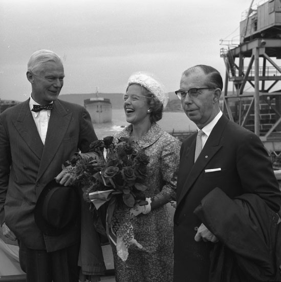 Dop och sjösättning av fartyg 186 M/T Fernmount. Fartygets gudmor och till höger om henne varvets dåvarande VD.