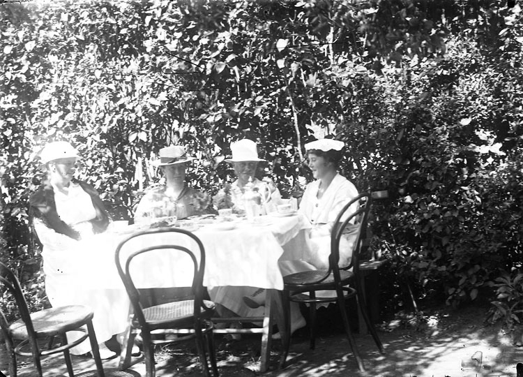 Kaffestund i solskenet. Böjträstolarna har plockats ut och satts runt trädgårdsbordet.