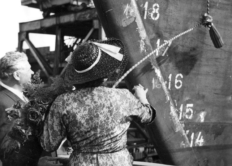 Vid dop och sjösättning av fartyg 124 M/T Astrid Elisabeth. Kvinnan med blombuketten är fartygets gudmor som just döper fartyget.