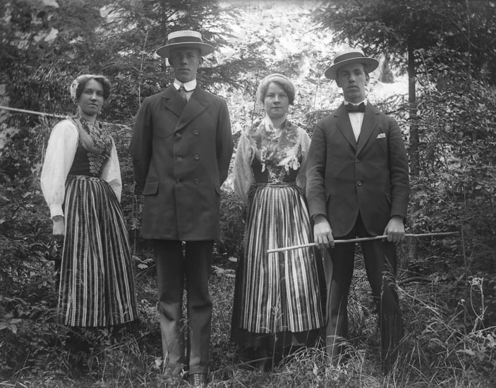 Finklädda yngre kvinnor och män poserar framför kameran - troligtvis en söndag på Ramdalen, Cederslund