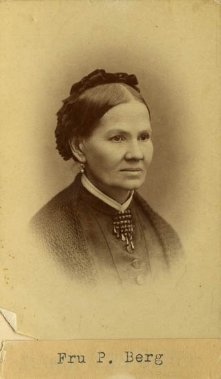 Text på kortets baksida: "Fru P. Berg gift med Grosshandlaren Paul Berg. Född 1806 död 1879".