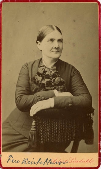 Text på kortets baksida: "Fru Kristiansson. Maka till kvartersman Johannes Kristoffersson".