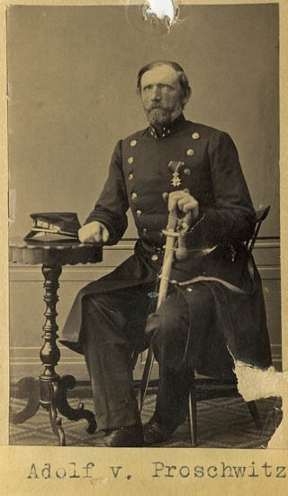 Text på kortets baksida: "Adolf von Proschwitz, f. 1817. Fullmakt 1836 jan. 23. Stångenäs comp.".