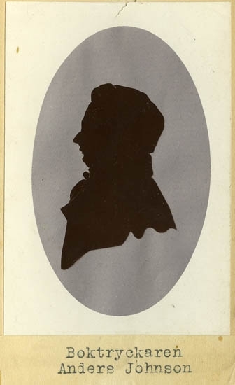 Text på kortets baksida: "Boktryckaren Anders Johnson, f. i Fiskebäckskil 29/9 1800 död i Uddewalla 16/5 1833. Redaktör för o ägare af Uddewalla Weckoblad från aug. 1826 till sin död. Gift 23/2 1828 med Elsa Johanna Barck, f. i Uddewalla 16/1 1795 död i Uddewalla 12/6 1841".