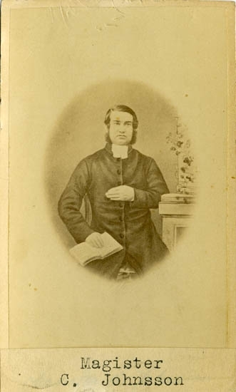 Text på kortets baksida: "Magister Casper Johan Johnsson, f. 1821 i Hvalinge, pastors son. Magister i Lund och Collega i Uddewalla 1843. Erhöll 16/6 1856 då han 10 år varit anställd vid skolan och senare år såsom rector under dennes sjukdom, en Caffekanna af silver, väg 50 lov. Comminister i Götheborgs Christine och Stadskateket. Död 1860 den 18 juli. Gift med M. B. Natt och Dag. En son, Birger är prest".