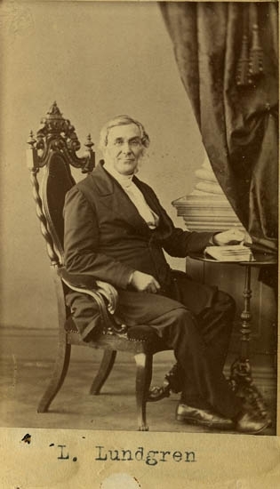 Text på kortets baksida: "Lorentz Lundgren. Bror till Teaterdiriktör L. Gift med Jeanna Malm".