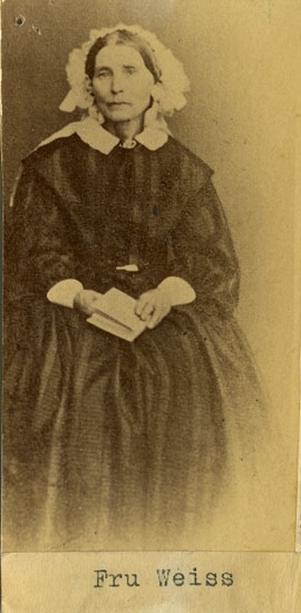 Text på kortets baksida: "Fru Anna Sofia Weiss, f. 21/4 1804 d. 8/5 1883. Gift med hattm.