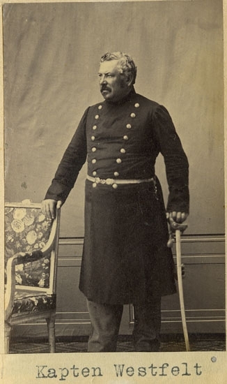 Text på kortets baksida: "Kapten Carl Johan Georg Wästfält, f. 1814 d. 1864. Fullmakt 1837 Dec. 15. Kapten o Chef Fräkne comp på Backamo".