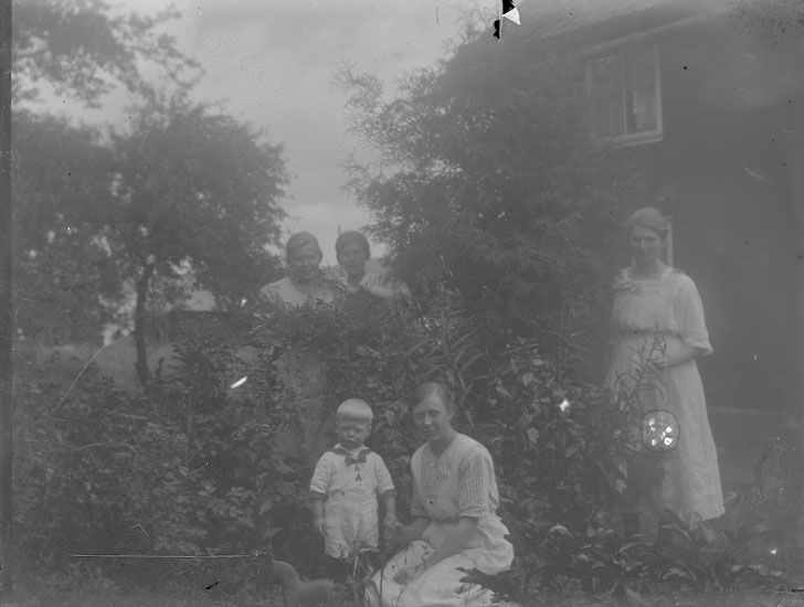 Enl. text i blå bok: "Fyra kvinnor och ett barn i trädgård."