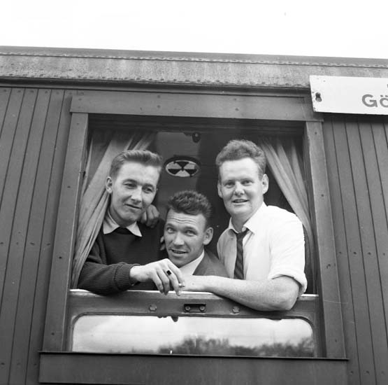 Spelare i fotbollslaget Oddevold tittar ut genom ett tågfönser under resa till Tyskland