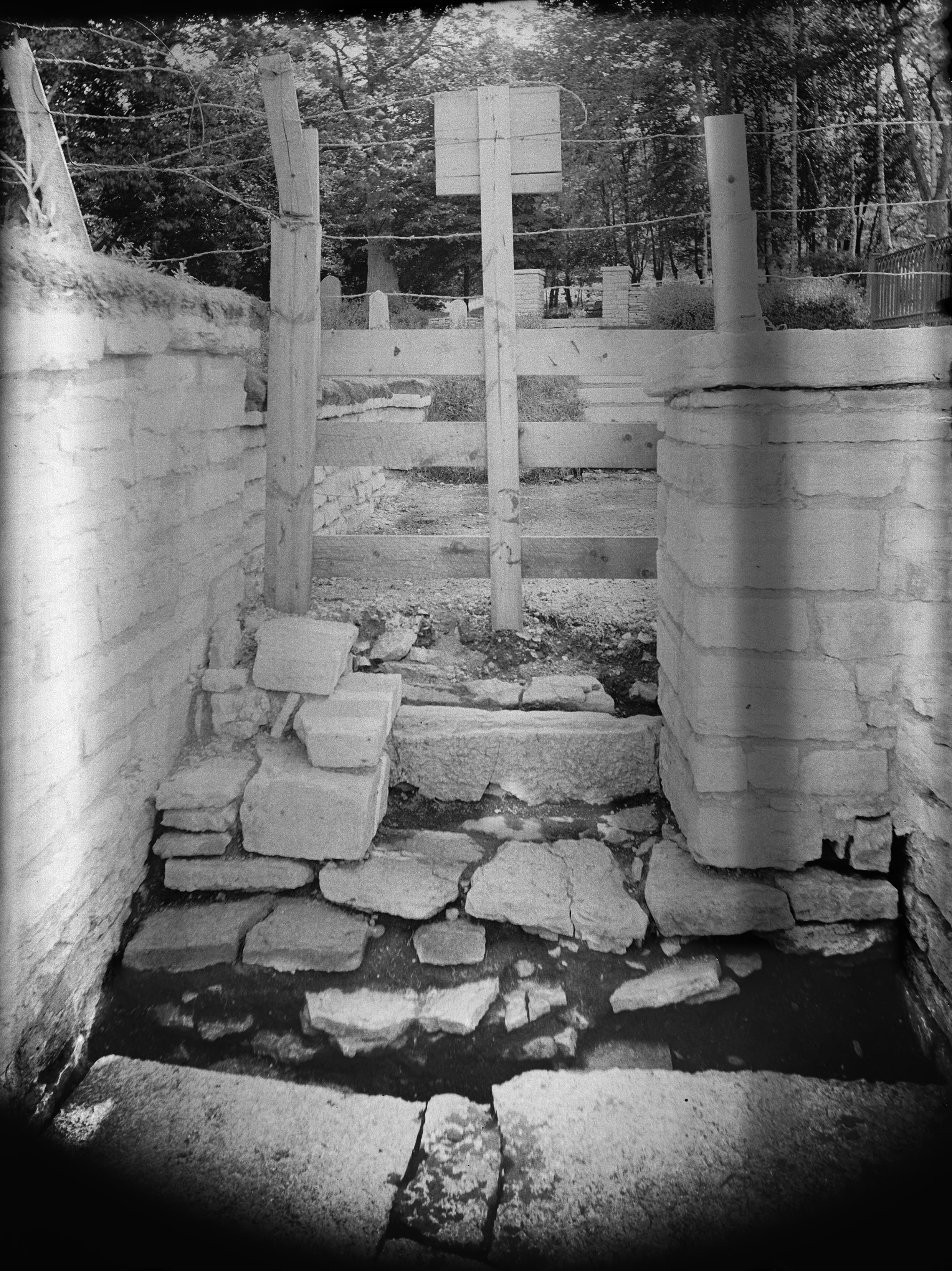 Östra förstugan, östra portens tröskel med partiell igenmurning. Från väster.