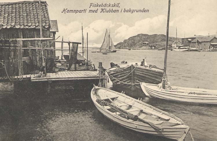 Tryckt text på kortet: "Fiskebäckskil. Hamnparti med Klubban i bakgrunden."