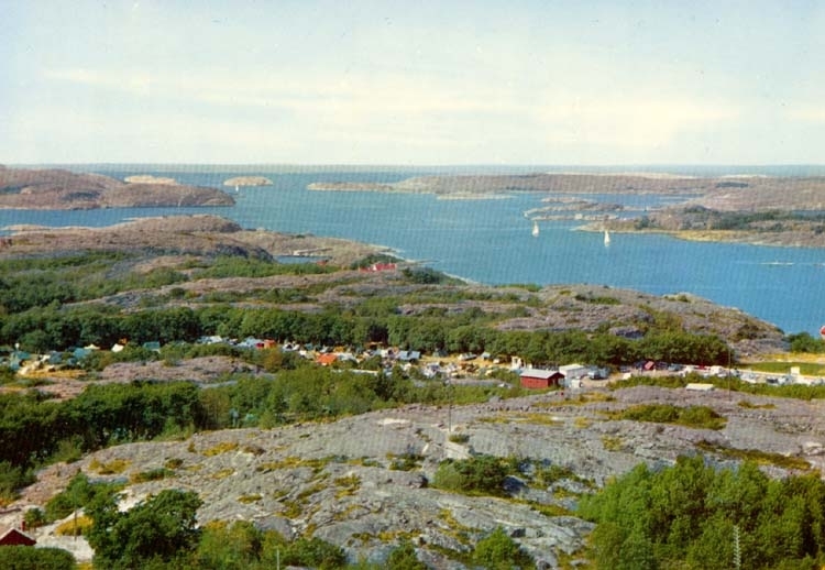 Tryckt text på kortet: "Grebbestad. Campingplats med havet i bakgrunden.."