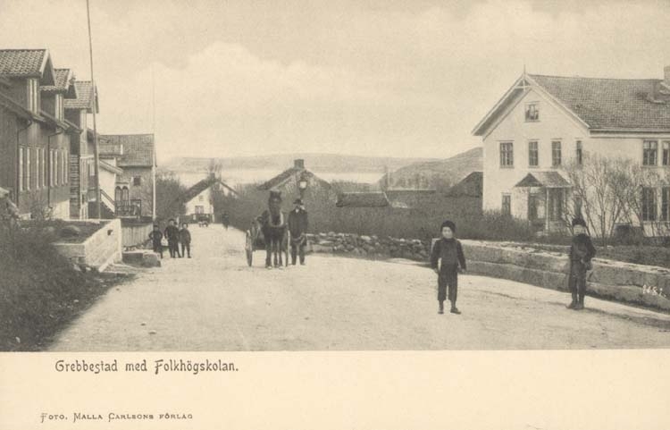 Tryckt text på kortet: "Grebbestad med Folkhögskolan."