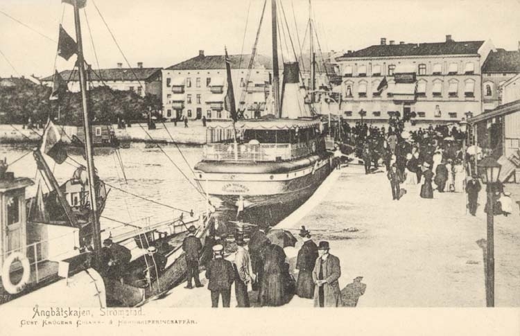 Tryckt text på kortet: "Ångbåtskajen, Strömstad."