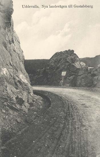 Titel: Tryckt text på kortet: "Uddevalla. Nya landsvägen till Gustafsberg." "Uddevalla Pappershandel, Hildur Andersson."