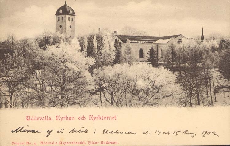 Tryckt text på kortet: "Kyrkan och Klocktornet, Uddevalla."