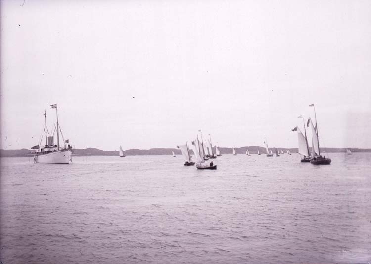 Vid H.M. Konungens Oscar II ankomst till Lysekil. Kungayachten Drott samt seglande Jullar och Kågar. Regatta?