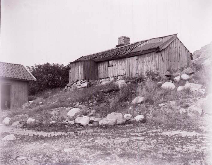 Enligt text som medföljde bilden: "Gammal stuga i Åkerbräcka - Gamma Agfa- Plåt, Brons- Kali d.18/7 20."