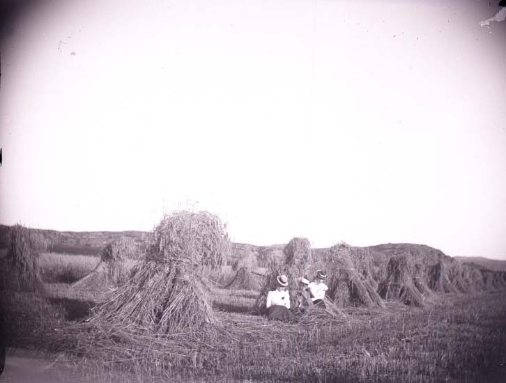 Enligt text som medföljde bilden: Anne Lyzell, Aågot Stub, Valter Lycke vid en sädesskyl. 6/8 1899 Fiskebäck.